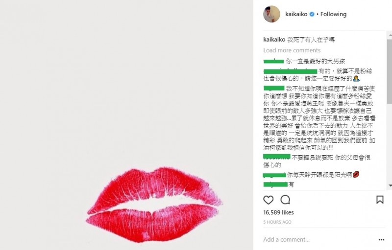 柯震東先是在Instagram曬出一張面無表情的自拍照,寫下「道別」,眾人以為是在揮別逝去的戀情,之後卻又貼出灰底紅唇印的圖,寫下「我死了有人在乎嗎」,讓粉絲看得傻眼。由於時間點敏感,粉絲希望柯震東能好好珍惜生命,千萬別做傻事,「這種話別亂說呀…你要好好的」、「不要輕易說要死,你的父母會很傷心的」、「每個人都是有存在價值的 ,我們都很在乎你,請你堅強起來!」