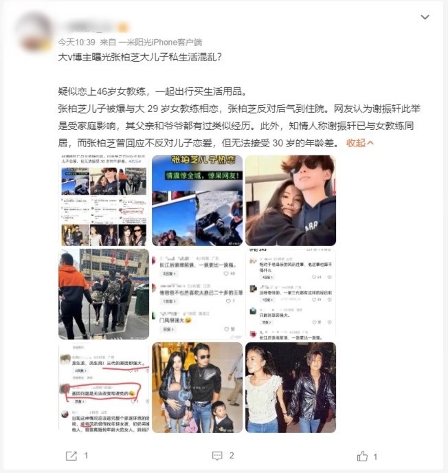 近日有網民有微博轉發張栢芝與謝霆鋒大仔Lucas的緋聞,以「大V部落客曝光張栢芝大兒子私生活混亂?」網民轉發的內容未見有照片,卻指「疑似戀上46歲女教練,一起出行買生活用品。張栢芝兒子被爆與大29歲女教練相戀,張栢芝反對後氣到住院。網友認為謝振軒此舉是受家庭影響,父親和爺爺都有類似經驗。此外,知情人稱謝振軒已與女教練同居,而張柏芝曾回應不反對兒子戀愛,但無法接受30歲的年齡差。」